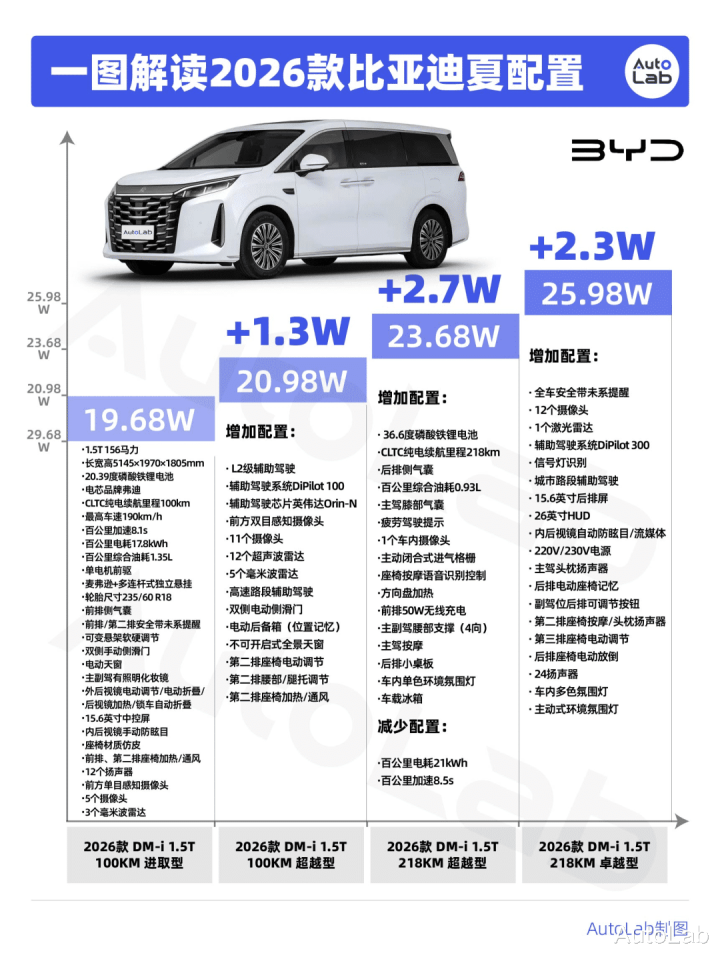 2026款比亚迪夏共有“100KM进取型”、“100KM超越型”、“218KM超越型”以及“218KM卓越型”这四个配置。